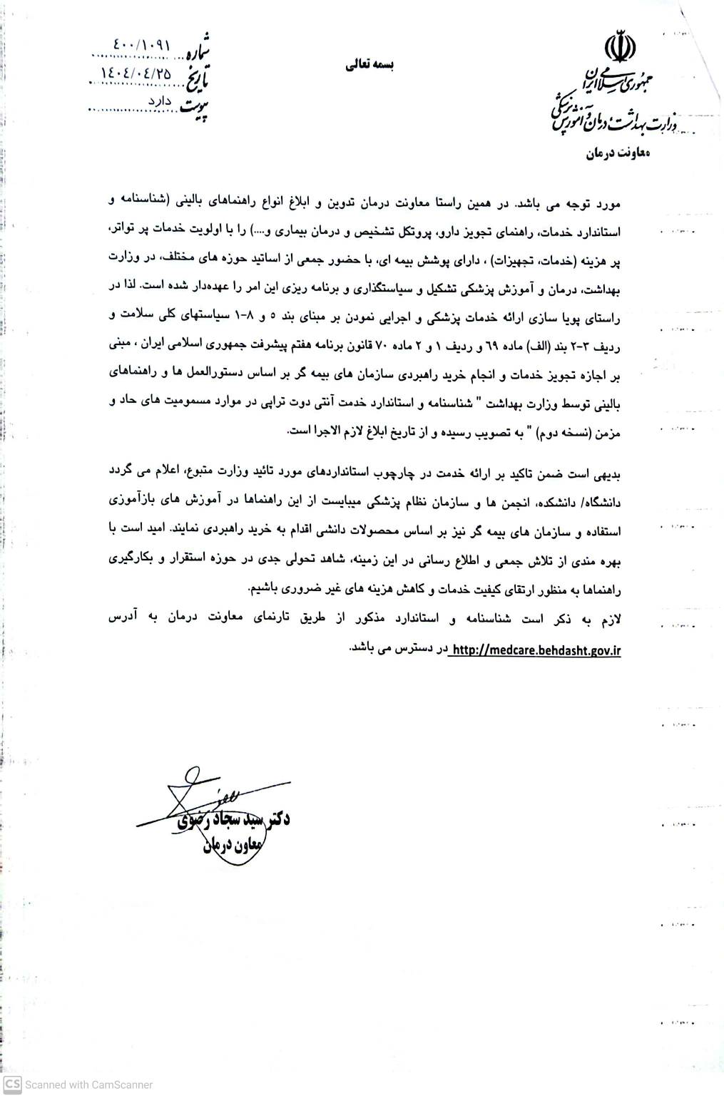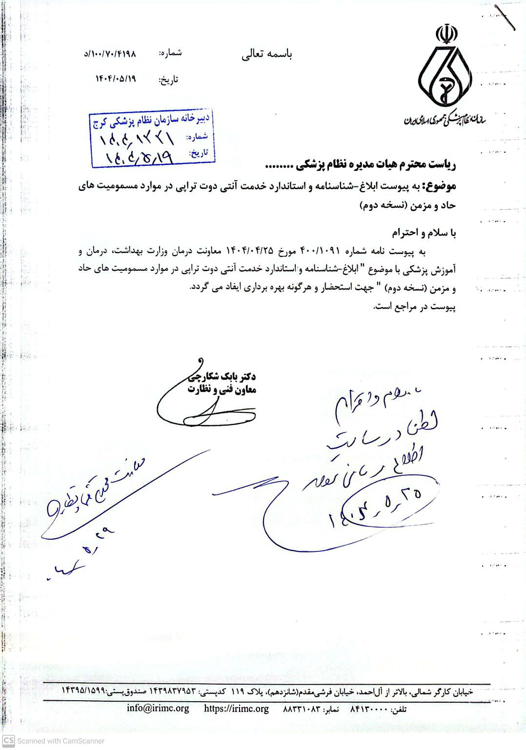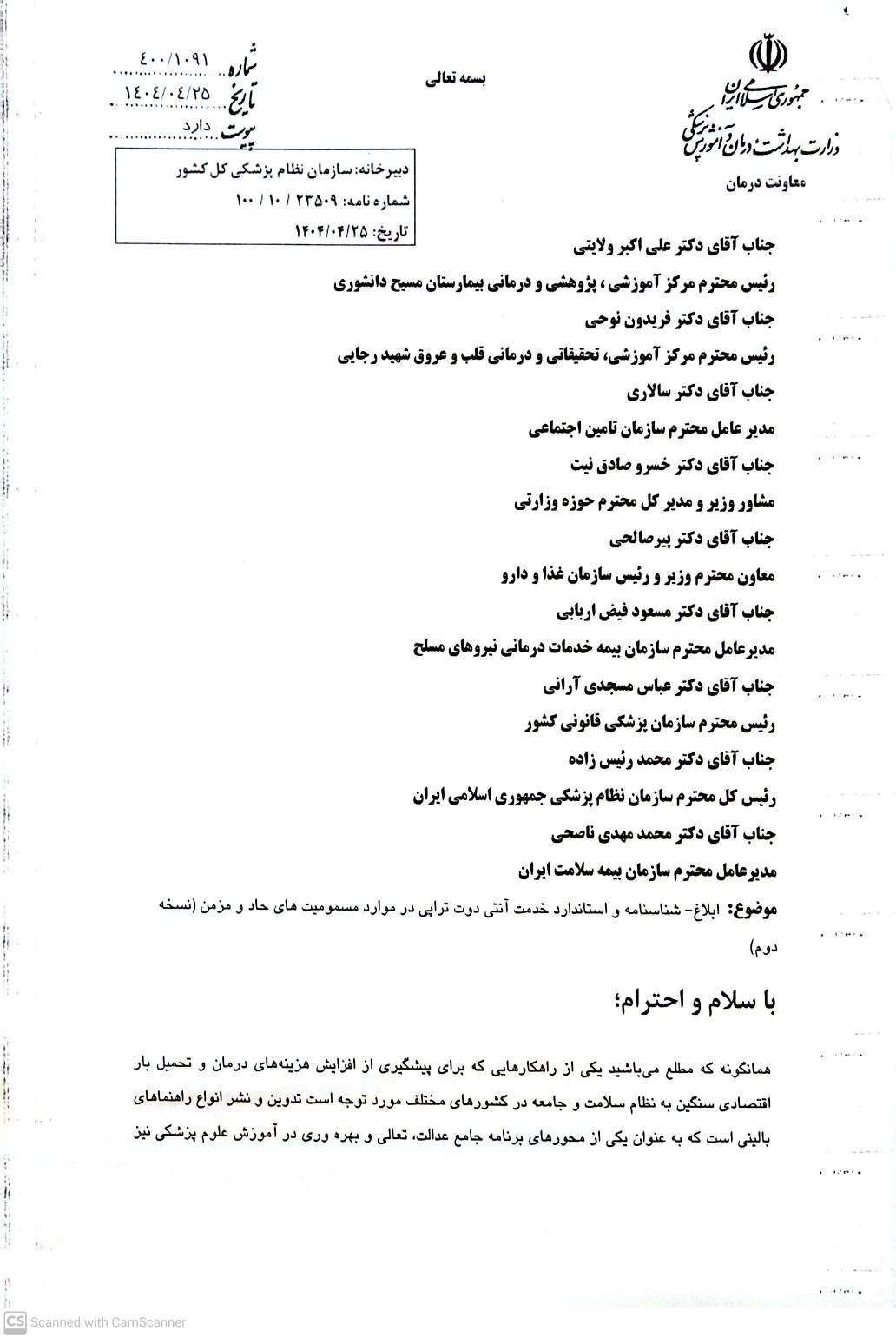 ♦️نامه معاونت درمان وزارت بهداشت،درمان و آموزش پزشکی با موضوع ابلاغ ـ شناسنامه و استاندارد خدمت آنتی دوت تراپی در موارد مسمومیت حاد و مزمن