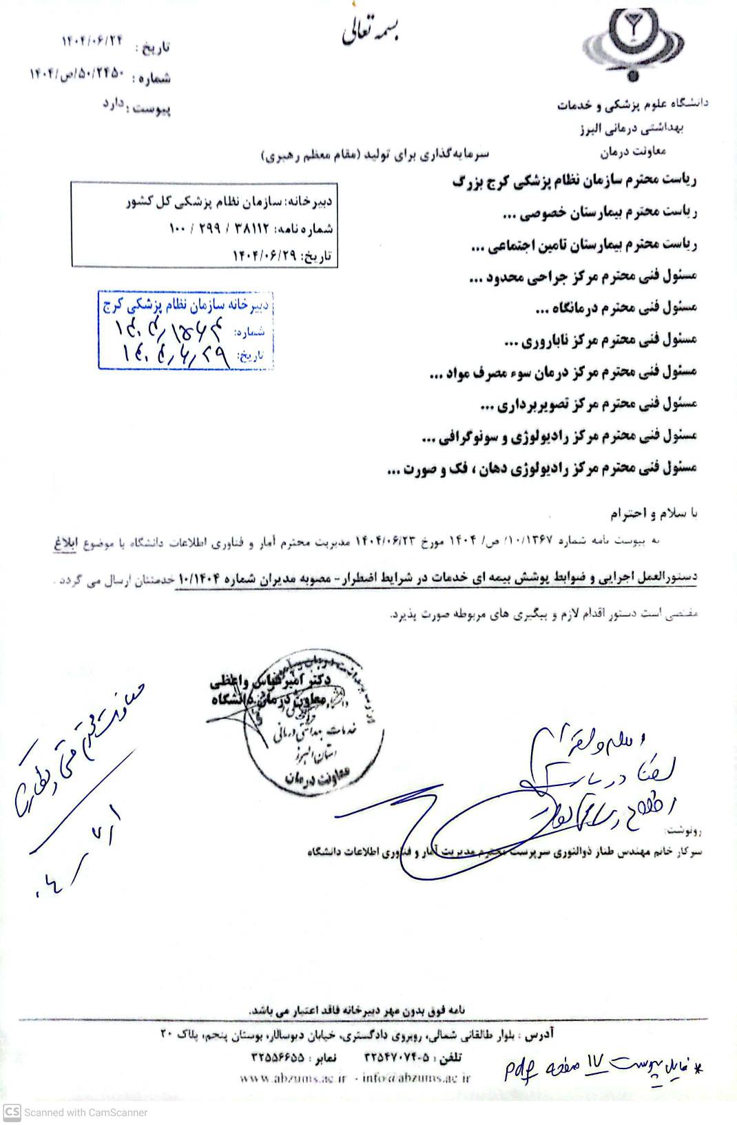 ♦️نامه مدیریت محترم آمار و فناوری اطلاعات دانشگاه با موضوع ابلاغ دستورالعمل و ضوابط پوشش بیمه ای خدمات در شرایط اضطرارـمصوبه مدیران