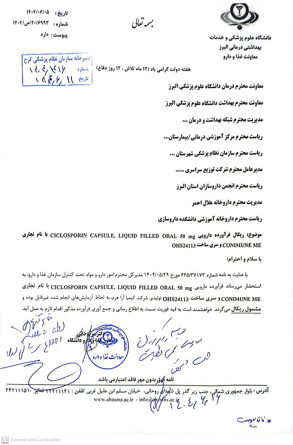 ♦️ریکال فرآورده دارویی CICLOSPORIN CAPSULE ✒️روابط عمومی نظام پزشکی کرج بزرگ