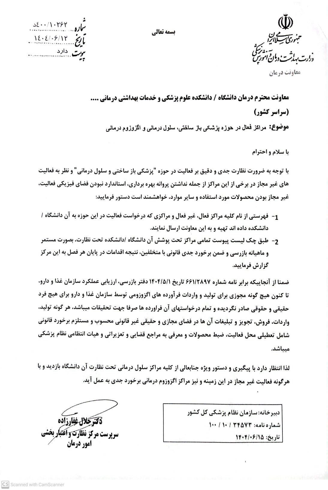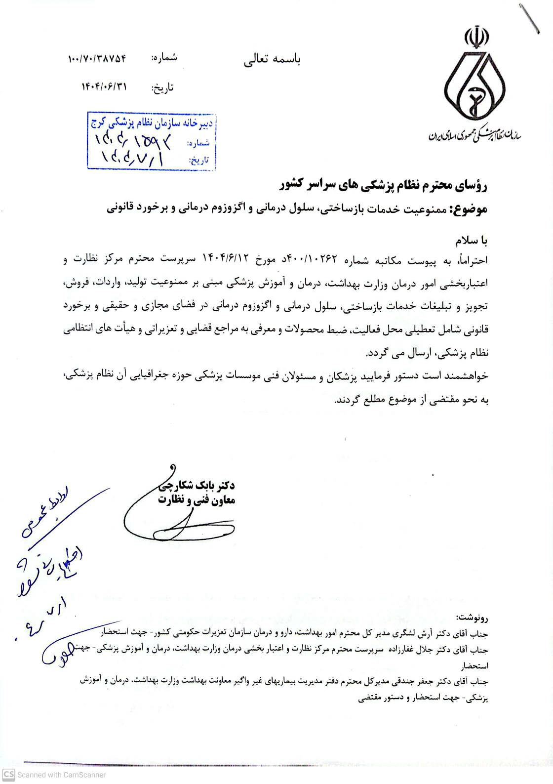 ♦️ممنوعیت خدمات بازساختی،سلول درمان و اگزوزوم درمانی و برخورد قانونی ✒️روابط عمومی نظام پزشکی کرج بزرگ