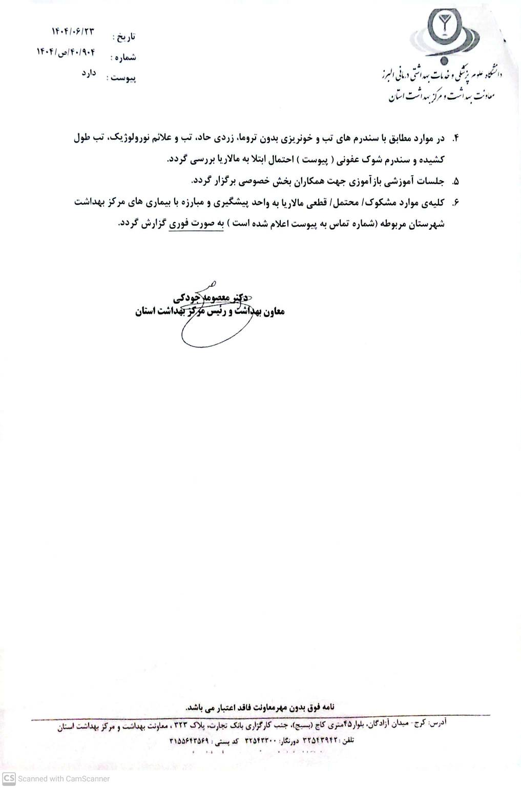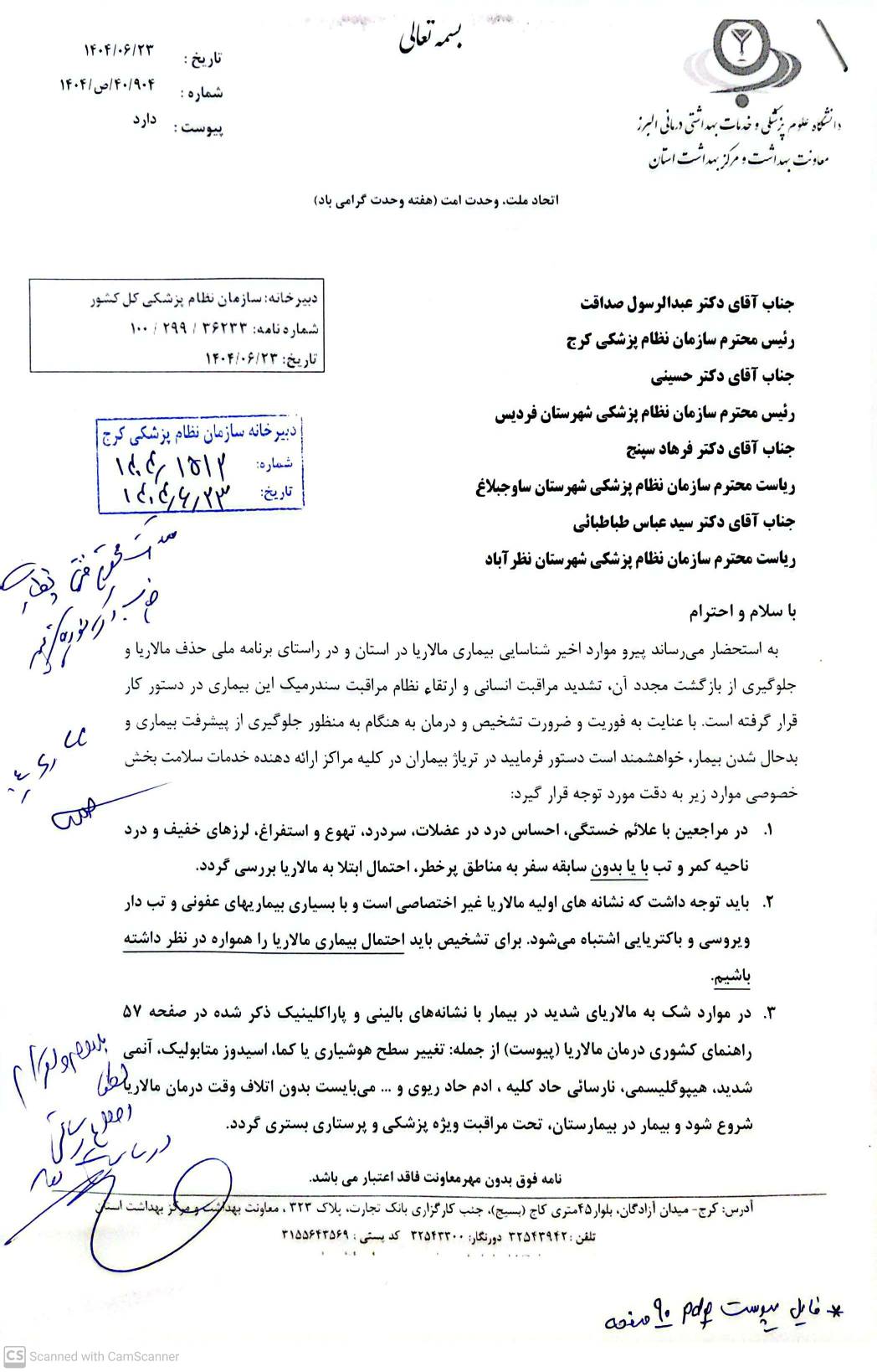 ♦️نامه معاون بهداشت و رئیس مرکز بهداشت استان با موضوع بیماری مالاریا ✒️روابط عمومی نظام پزشکی کرج بزرگ