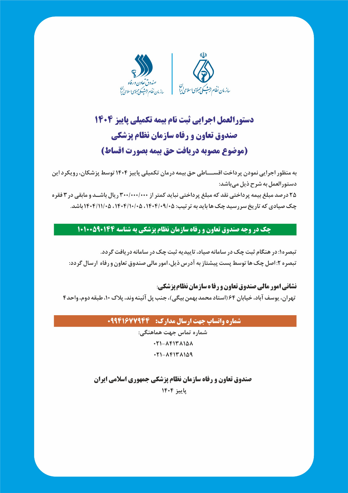 برای ثبت نام غیر حضوری به شماره واتس اپ سازمان نظام پزشکی ساوجبلاغ پیام ارسال نمایید.