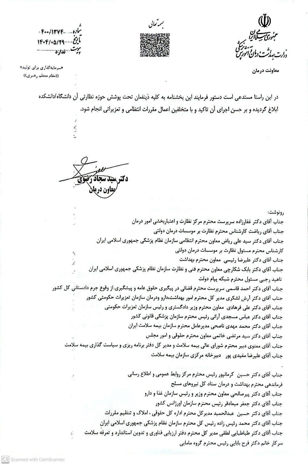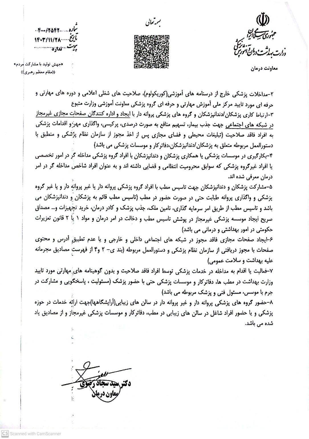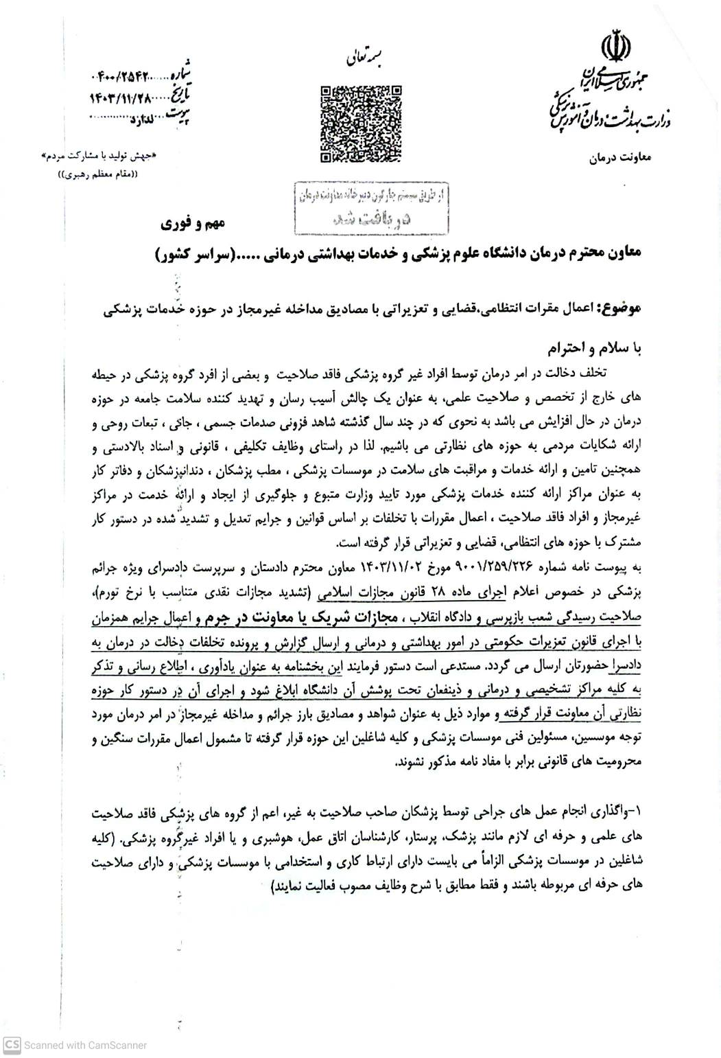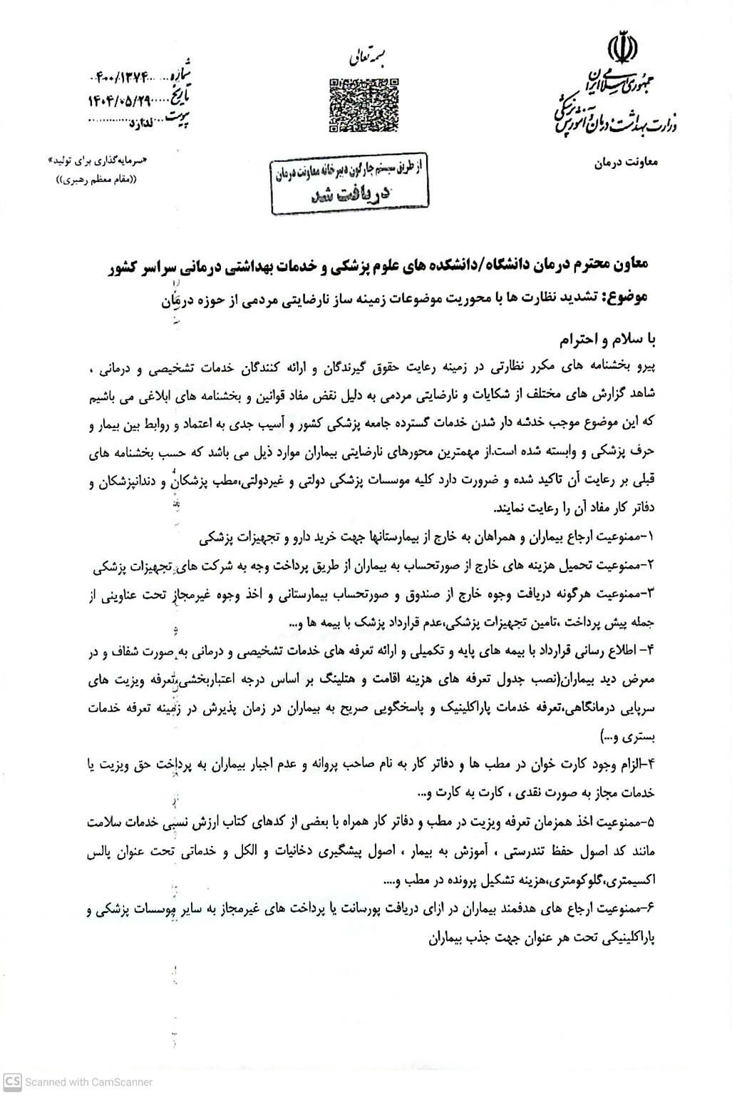♦️نامه معاونت محترم درمان وزارت متبوع مبنی بر تاکید رعایت مفاد نامه مذکور در زمینه رعایت حقوق گیرندگان و ارائه کنندگان خدمات تشخیصی و درمانی در مطب