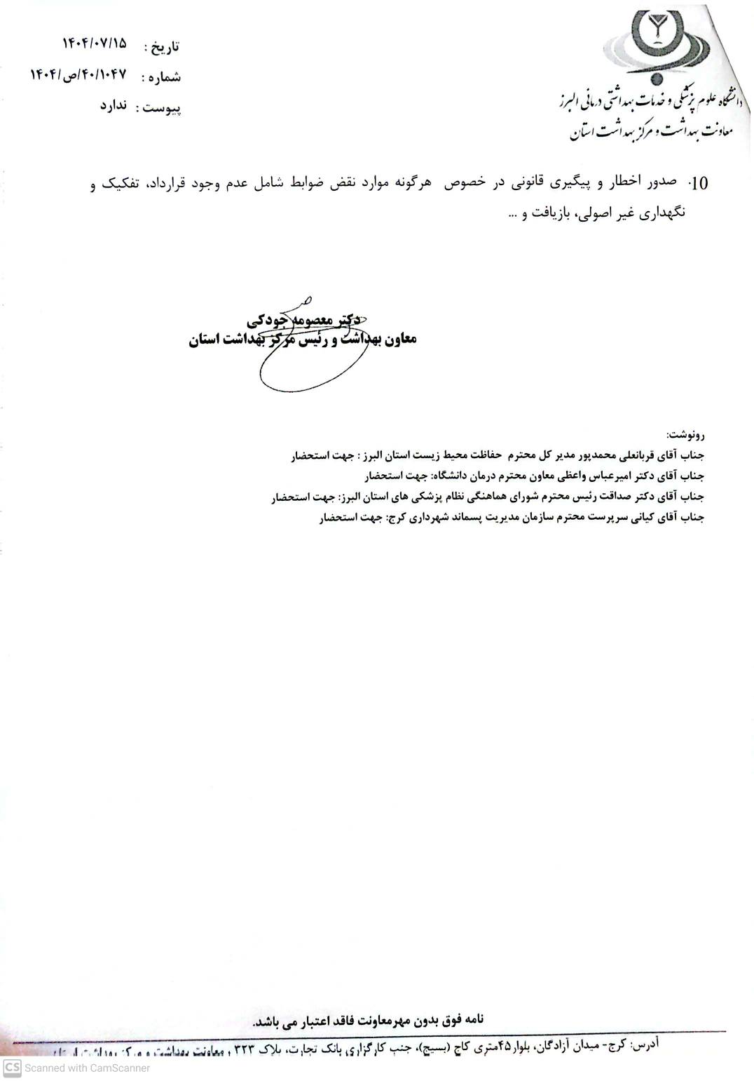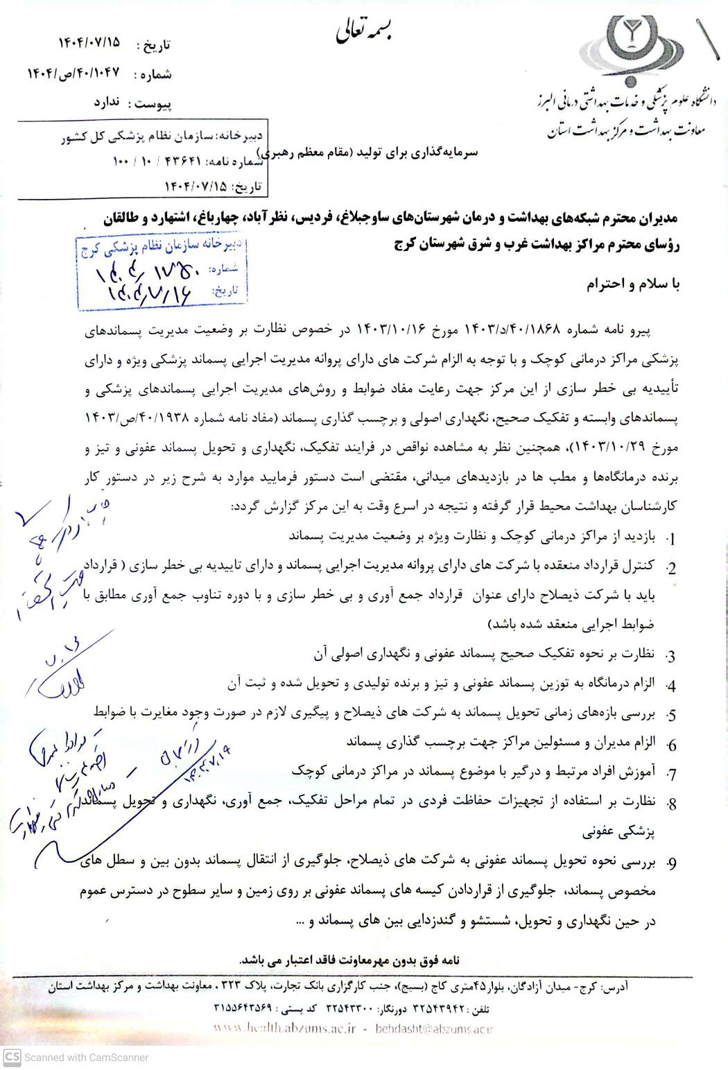 ♦️نامه معاون بهداشت و رئیس مرکز بهداشت استان در خصوص نظارت بر وضعیت پسماندهای پزشکی مراکز درمانی کوچک