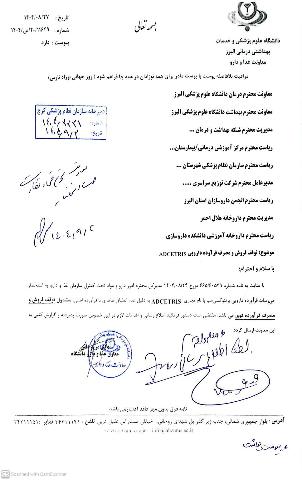 ♦️نامه مدیرکل محترم امور دارو و مواد تحت کنترل سازمان غذا و دارو با موضوع توقف فروش مصرف فرآورده دارویی برنتوکسی با نام تجاری ADCETRIS