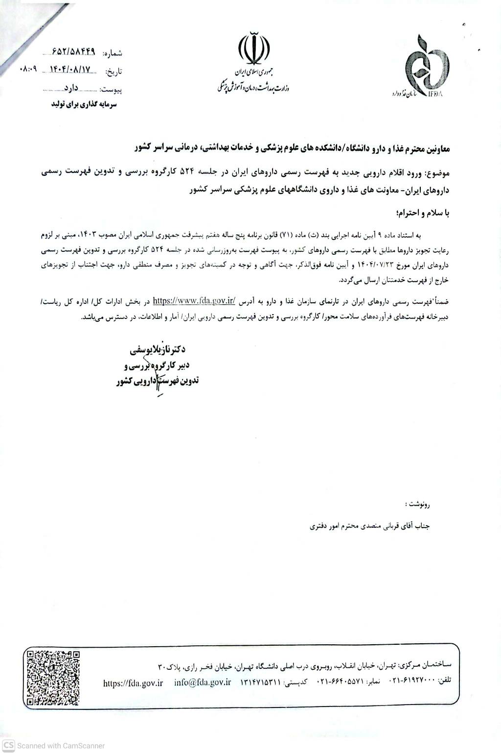 ♦️نامه دبیر محترم کارگروه بررسی و تدوین فهرست دارویی کشور در خصوص ورود اقلام دارویی جدید به فهرست رسمی داروهای ایران