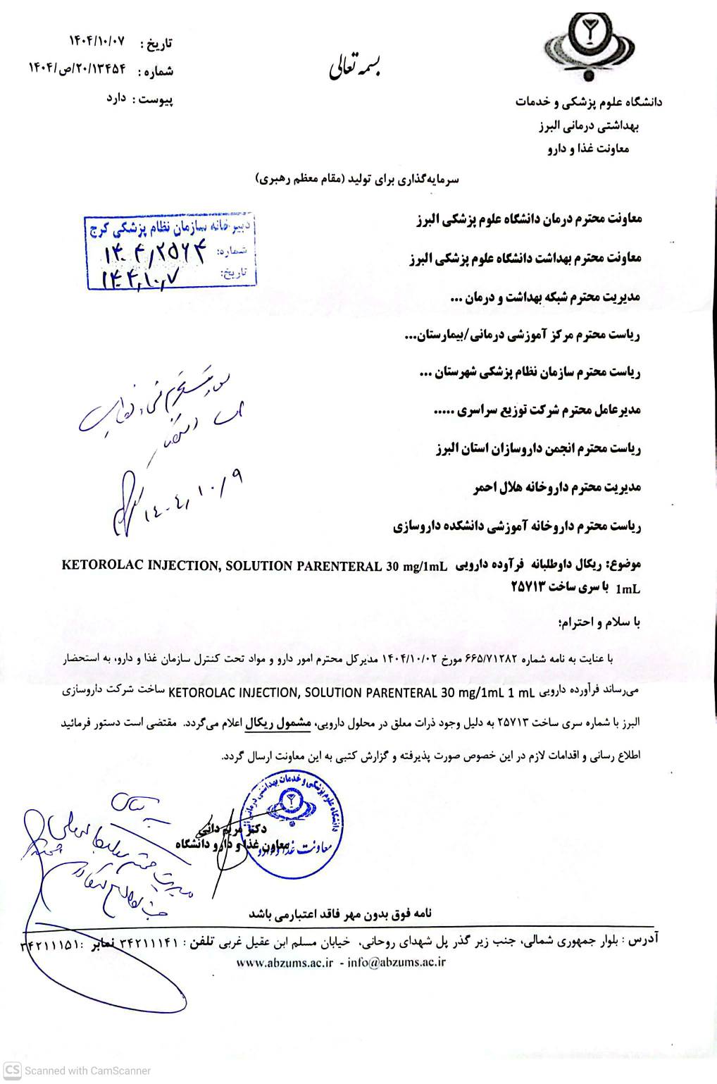 ♦️نامه مدیرکل محترم امور دارو و مواد تحت کنترل سازمان غذا و دارو با موضوع ریکال فرآورده دارویی KETOROLAC INJECTION ساخت شرکت داروسازی البرز