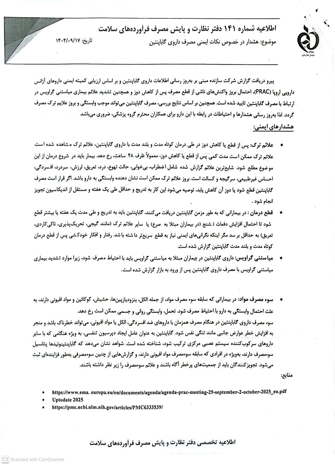 ♦️نامه مدیرکل محترم دفتر نظارت و پایش مصرف فرآورده های سلامت،با موضوع هشدارهای ایمنی مصرف داروی گاباپنتین