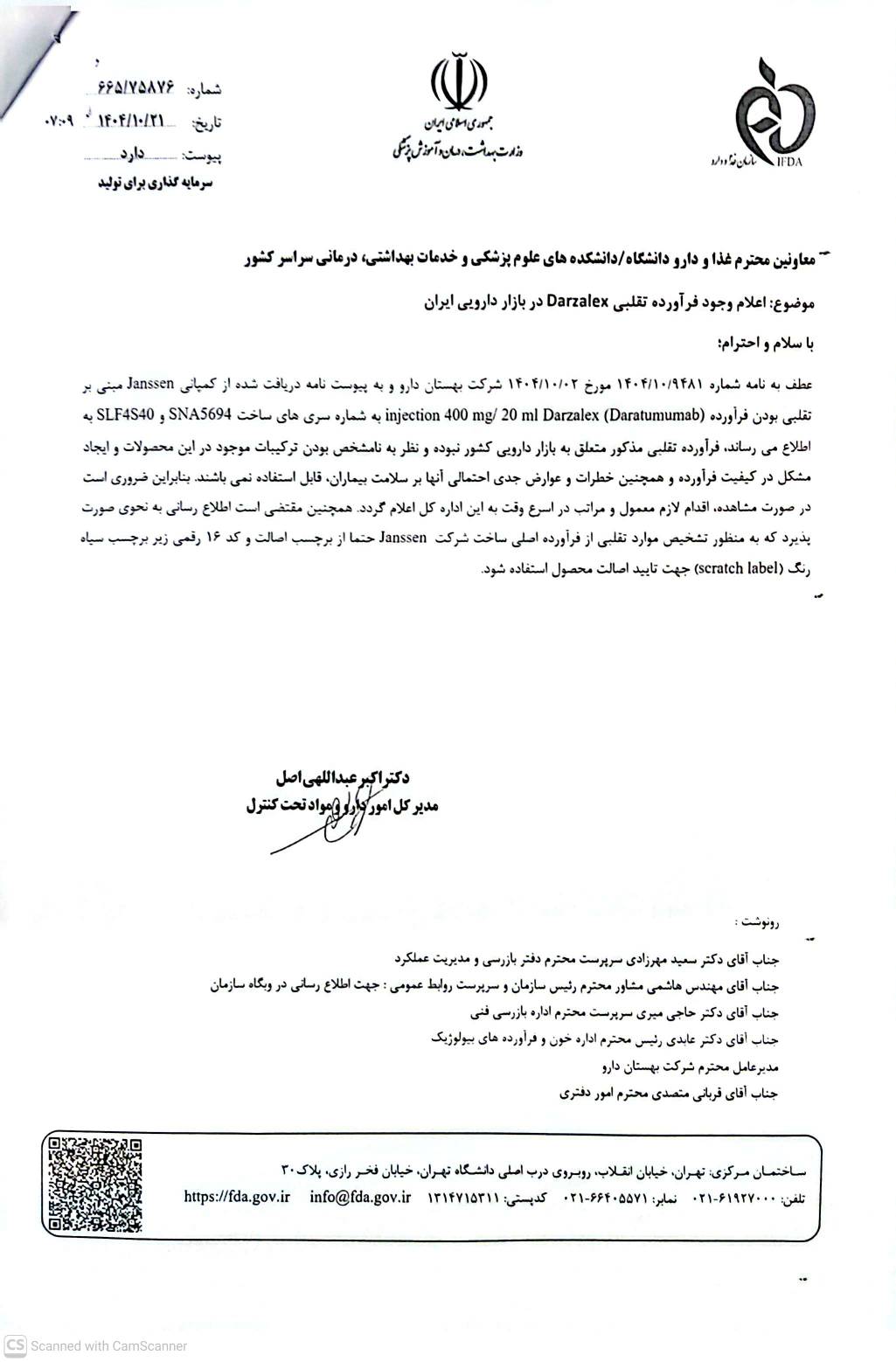 ♦️نامه مدیرکل محترم امور و مواد تحت کنترل سازمان غذا و دارو با موضوع تقلبی بودن فرآورده دارویی Darzalex injection 400 mg