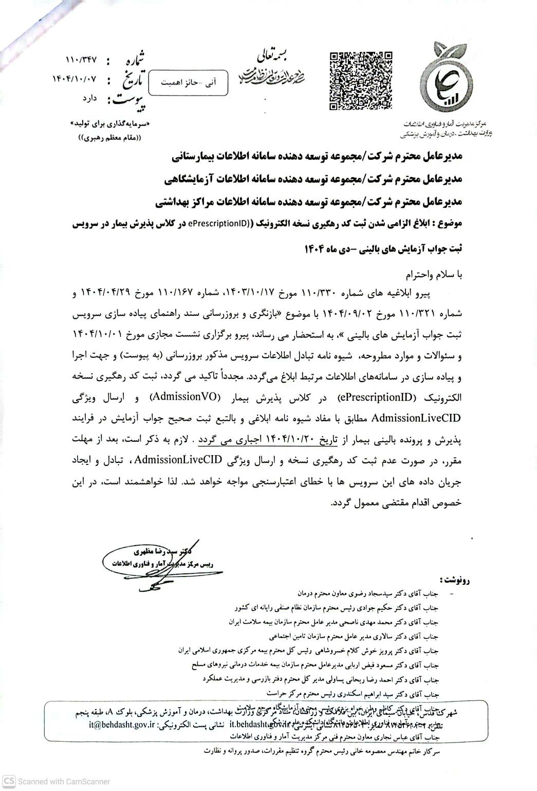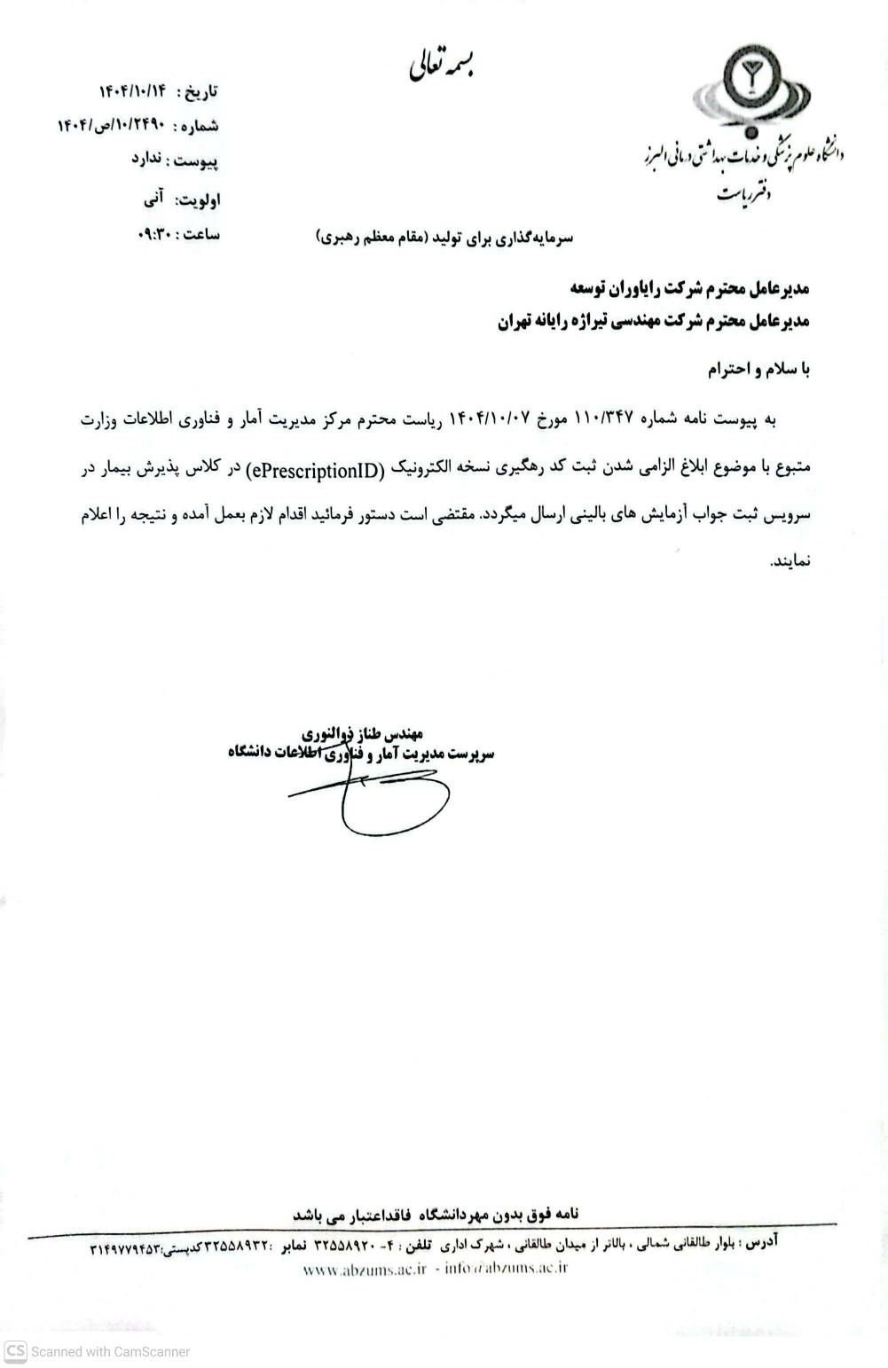 ♦️نامه مدیریت محترم آمار و فناوری اطلاعات دانشگاه با موضوع ابلاغ الزامی شدن ثبت کد رهگیری نسخه الکترونیک در کلاس پذیرش بیمار در سرویس ثبت جواب آزمایش های بالینی در ماه ۱۴۰۴