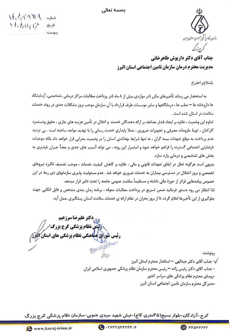 ♦️نامه دکتر سرزعیم رئیس محترم نظام پزشکی کرج بزرگ به مدیریت محترم درمان سازمان تامین اجتماعی استان البرز